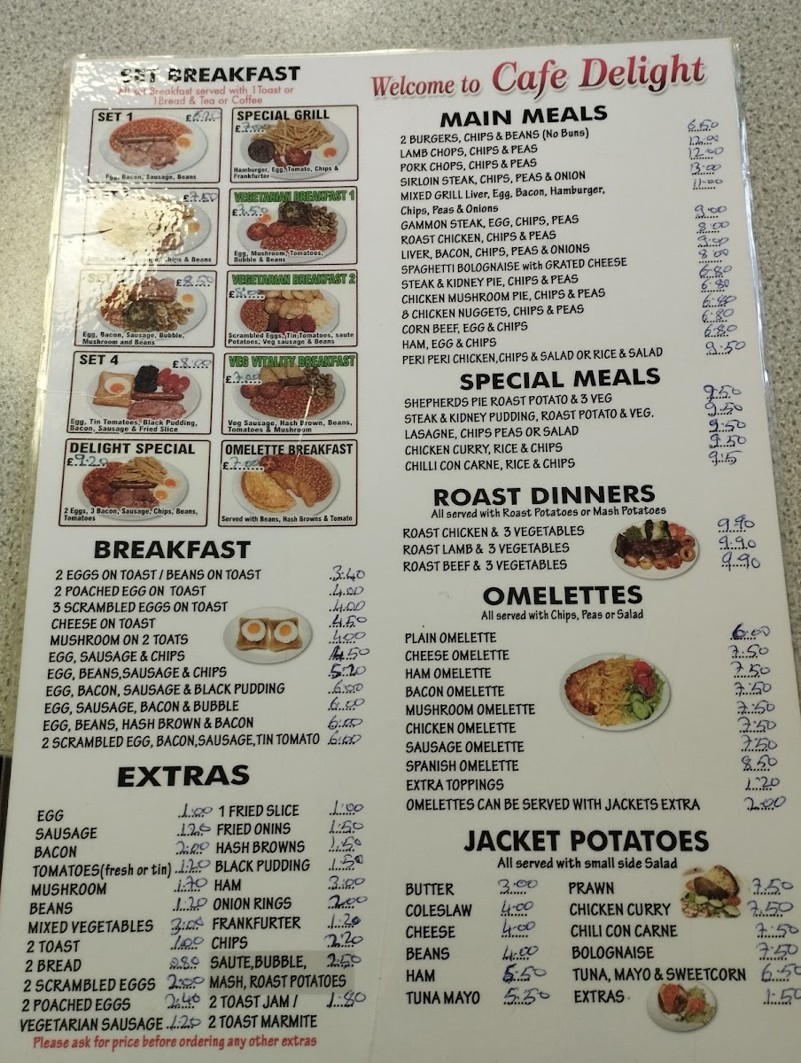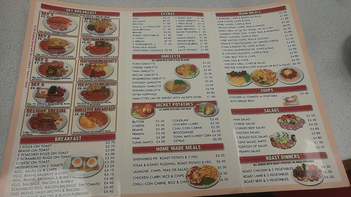 For those seeking a lighter touch, salads are plentiful, including ham, cheese, and chicken salads, all fresh and flavorful. As a delightful conclusion to your meal, the dessert menu offers tempting choices like apple pie with ice cream or custard and the classic Knickerbocker Glory. Customers rave about the friendly service, quick preparation, and the delicious breakfast options that are perfectly cooked, making every visit feel special. Stop by, and let Cafe Delight enchant your palate!