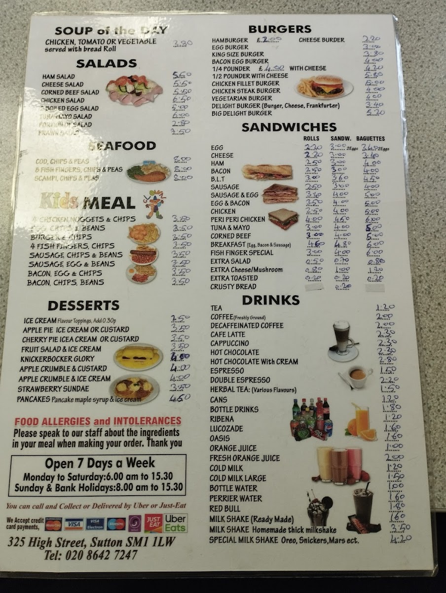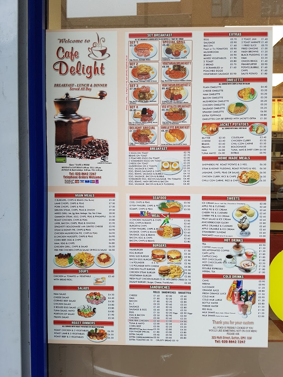 Welcome to Cafe Delight, a hidden gem nestled in the heart of Sutton. At this charming cafe located at Mini Stor, 325 High St, Sutton SM1 1LW, you can indulge in a variety of comforting dishes that cater to all tastes. The menu boasts daily selections like the Soup of the Day, featuring options such as chicken, tomato, or vegetable, perfect for warming your soul.